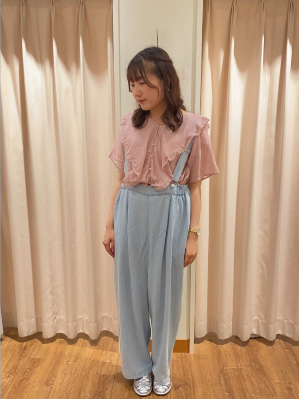 サロペットはハイウエストなので脚長効果があります😌インナーをかえることで、オールシーズン使える万能アイテムです! ピンクのフリルブラウスとあわせて甘めコーデを組みました🎀