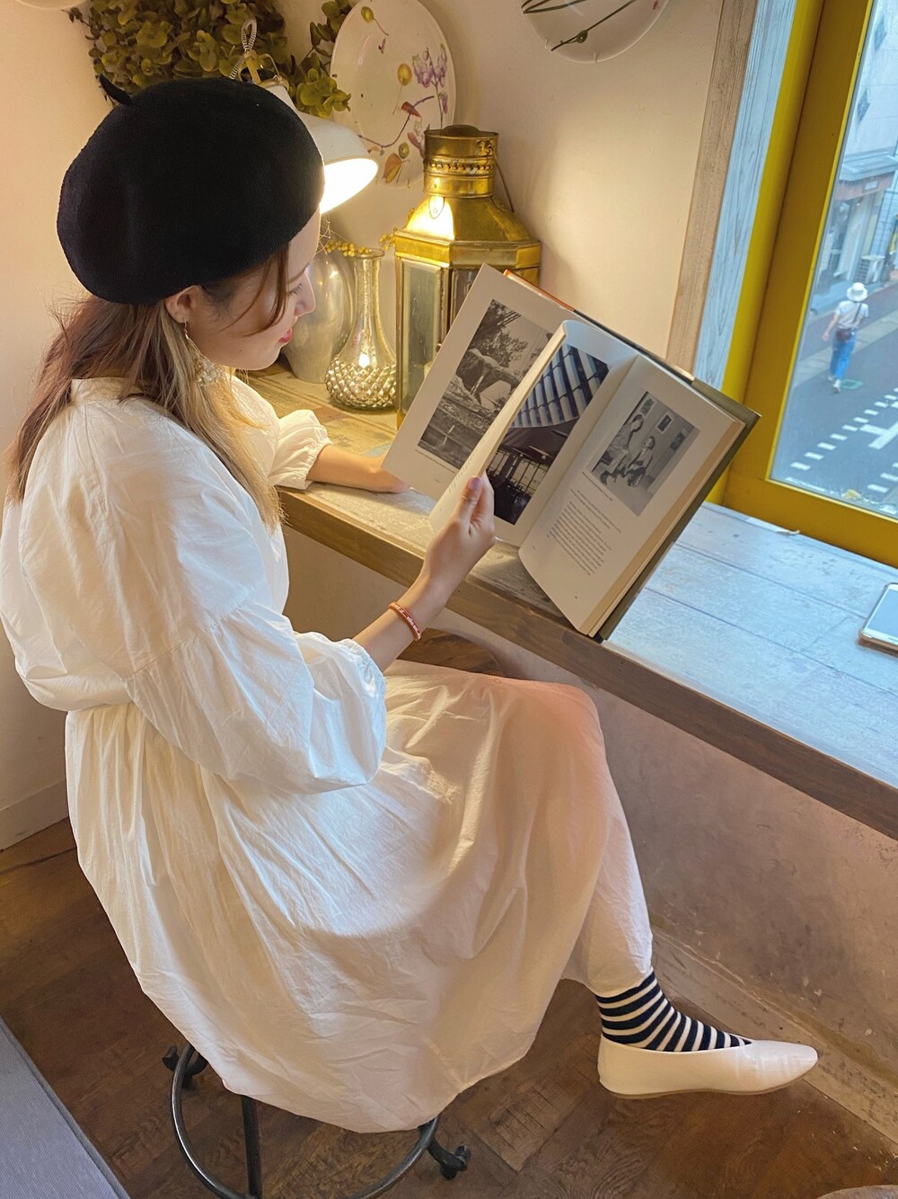 白ワンピモノトーンコーデ🖤🤍 ベレー帽も久しぶりに被ってカフェ行きました! ボーダーソックスを履いてワンポイント入れました🕊