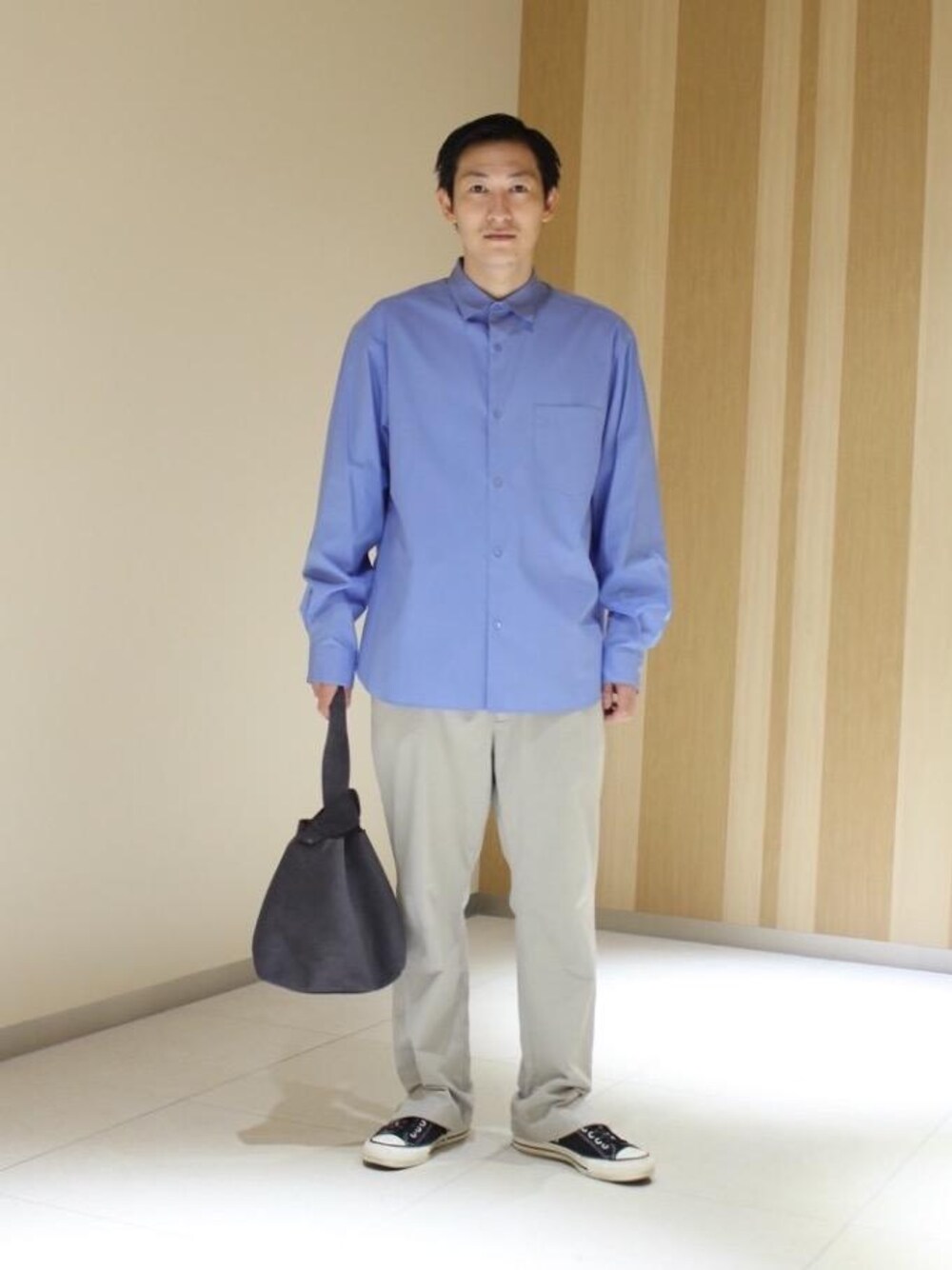 キレイ目な生地感のシャツですが、大きめのサイズをチョイスし、こなれ感を演出しました。