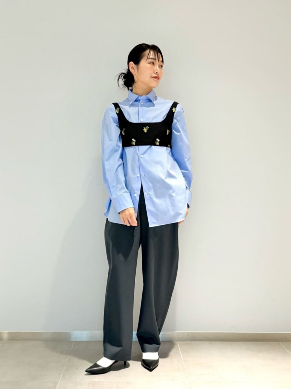 ◆身長 163cm ◆サイズ トップス・ワンピース:38(M) ボトムス:38(M) シューズ:37h(24.5cm) 【サイズ感】 ビスチェ/肩まわりはコンパクト。背中のアジャスターで調整できます。 ボトムス/標準的 【コーディネートポイント】 マニッシュなシャツとパンツにレモン柄のビスチェを合わせて遊び心をプラスしました。