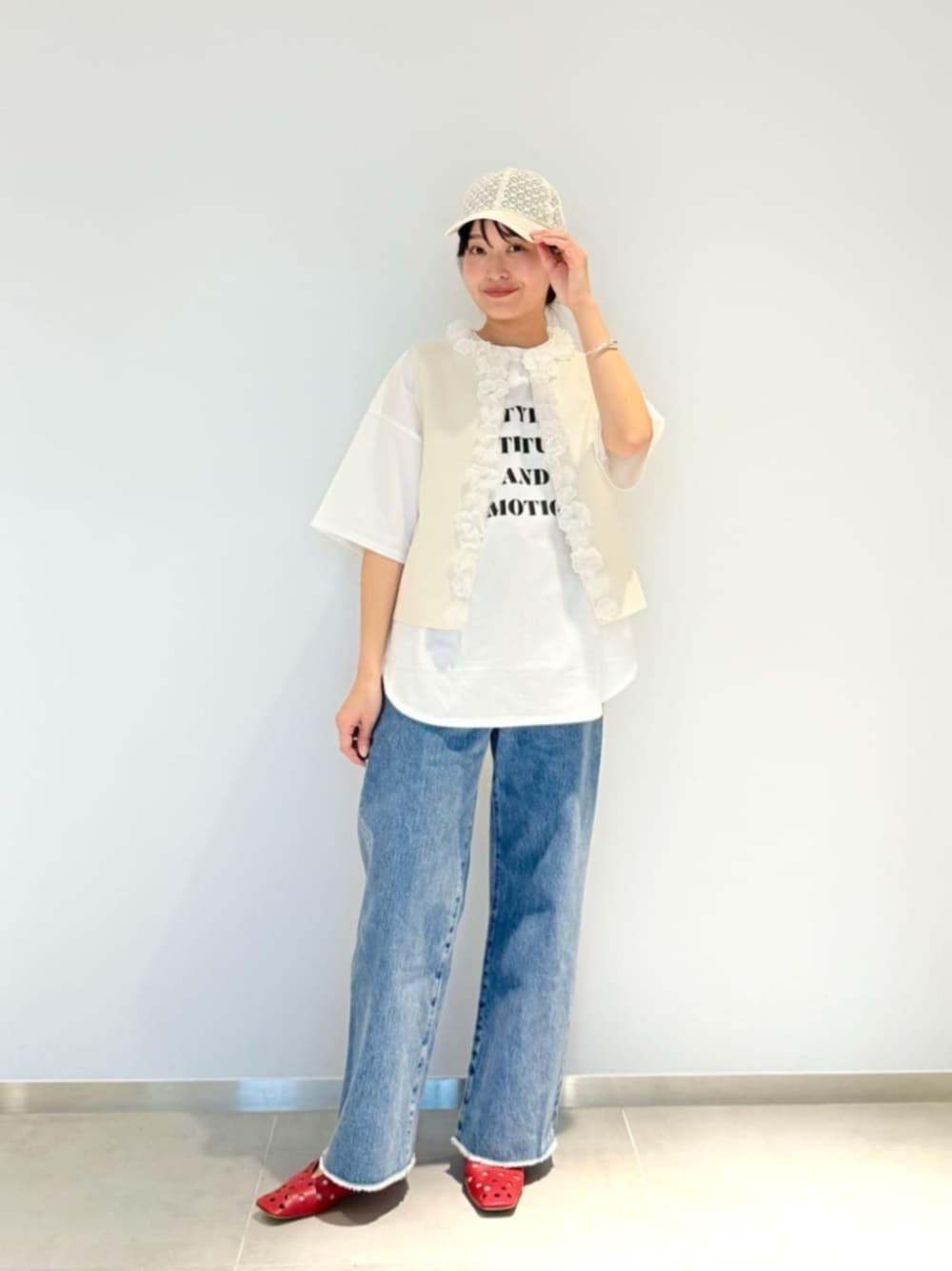 ◆身長 163cm ◆サイズ トップス・ワンピース:38(M) ボトムス:38(M) シューズ:37h(24.5cm) 【サイズ感】 ベスト/程よくフィット感あり。 ボトムス/腰回りすこしタイト。 【コーディネートポイント】 顔まわりはレースやフラワーモチーフでフェミニンな要素をプラスし、デニムでカジュアルダウンさせました。 #骨格ストレート #ブルベ冬