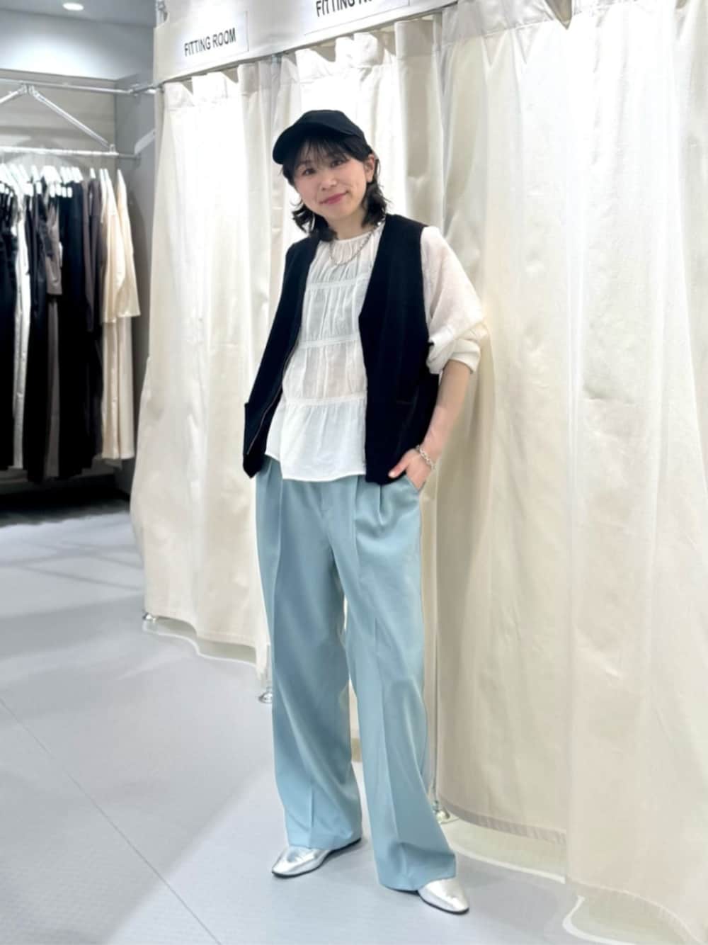 ▶︎身長 159㎝ ▶︎サイズ トップス 36 ( S ) /ボトムス 34 ( XS ) シューズ 36 ( 23㎝ ) [サイズ感] トップス:ややゆったり 全体的にややゆったり ベスト:ゆったり ボトムス:ややゆったり シューズ:ゆったり [コーディネート] メンズライクなアイテムにブラウスを合わせて甘さを控えめに。 透け感が非常に強いので白やベージュのインナーを選ぶと透け感を和らげることができます