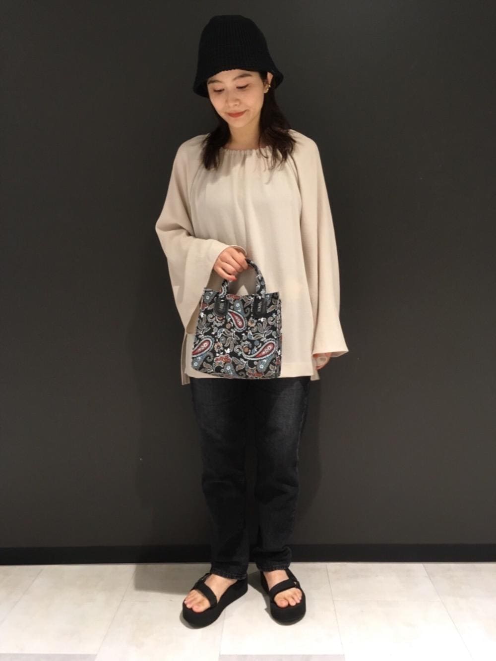 女性らしいブラウスに小物はカジュアルな物を選ぶことで、フェミニン過ぎない印象でまとめました。