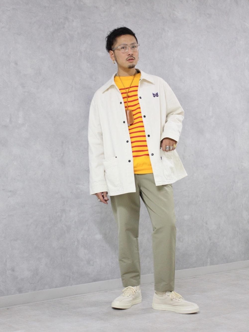【身長】176㎝ 【普段のサイズ】 トップスL ボトムス/L シューズ/27㎝ 【素材・サイズ感・着心地】 トップス:ゆったり。伸縮なし。光沢なし。 ボトムス:ややゆったり。伸縮あり。 【コーディネートポイント】 トップスはホワイトで合わせ、春らしく柔らかい雰囲気にしました。また、インナーを差し色で合わせる事で色にメリハリが付き、ワンランク上のお洒落が楽しめるのでおすすめです。これからの時季は小物アイテムも一つのアクセントとしてお使い頂けます。