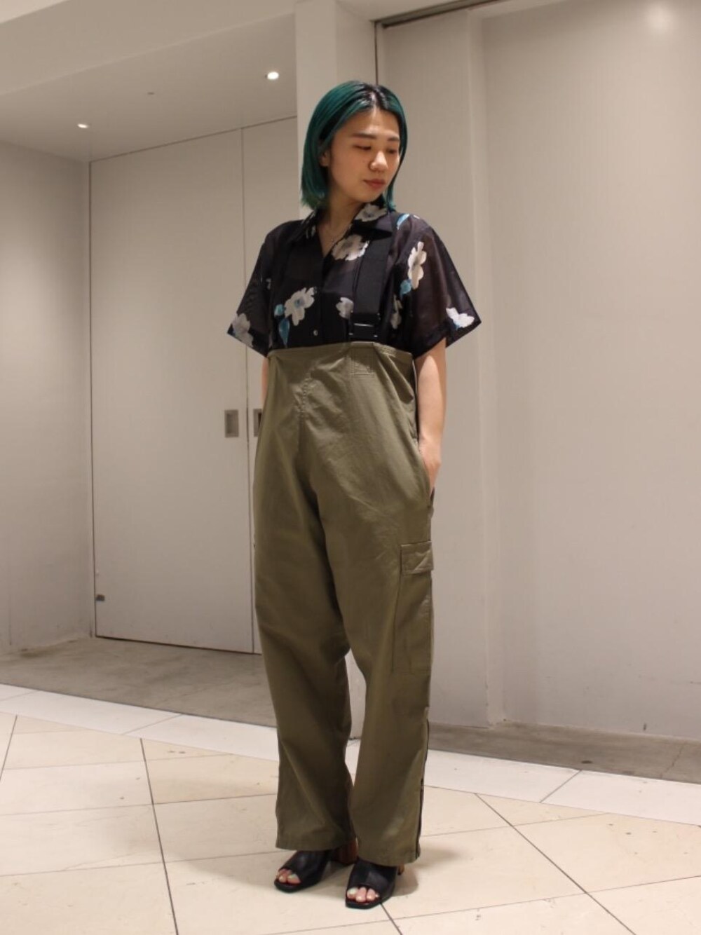 フラワープリントのシャツを<TOWN CRAFT>別注オーバーオールと合わせてカジュアルなコーディネートにしました。シャツの透け感と足元のサンダルで、季節感を取り入れてみました。
