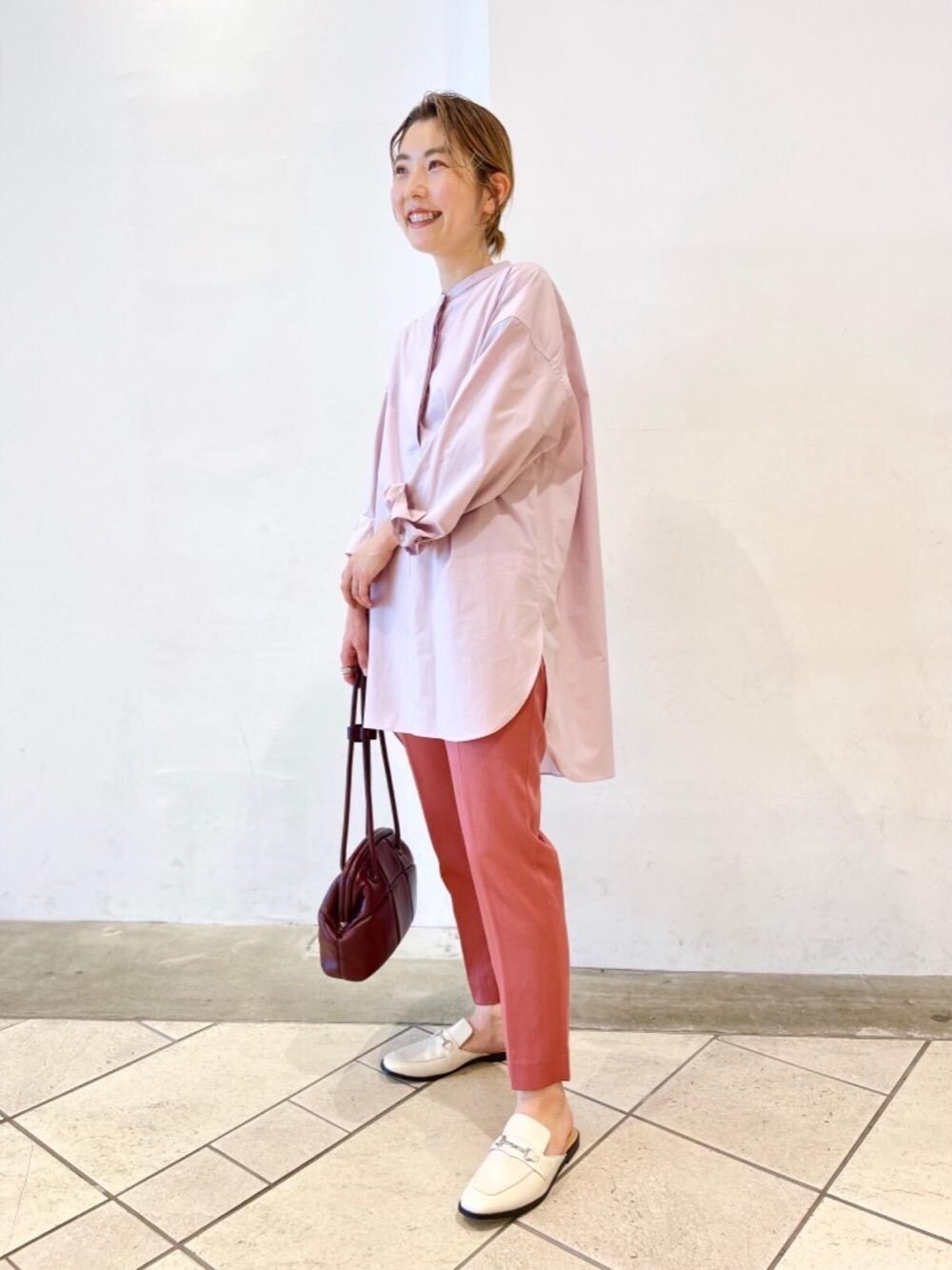身長:158㎝ 普段サイズ: トップス/S、パンツ/S、シューズ/23.5㎝ 【サイズ感】 トップス:ゆったり パンツ:やや細身 シューズ:23㎝は少し小さかった為、24㎝にしました。 【素材感】 トップス:パリッと張りのある薄手のコットン素材 パンツ:光沢感あり、薄手のサテン地 【着心地】 トップス:程良いゆとりがあり、1枚でもレイヤードでも使いやすいです。 パンツ:ウエストゴムで着脱しやすい。履き心地も軽くデイリーユースしやすいです。 【コーディネートポイント】 ピンクワントーンでまとまりを持たせました。人気のシャツは新色を加え、合わせやすい4色展開です。トレンドのベストなどとレイヤードしても可愛いですね!シャツ、パンツ共にON、OFF使える万能アイテムです。 8/21(土)から8/30(月)の期間中、〈ADD CULUMN〉の販売会を開催いたします。