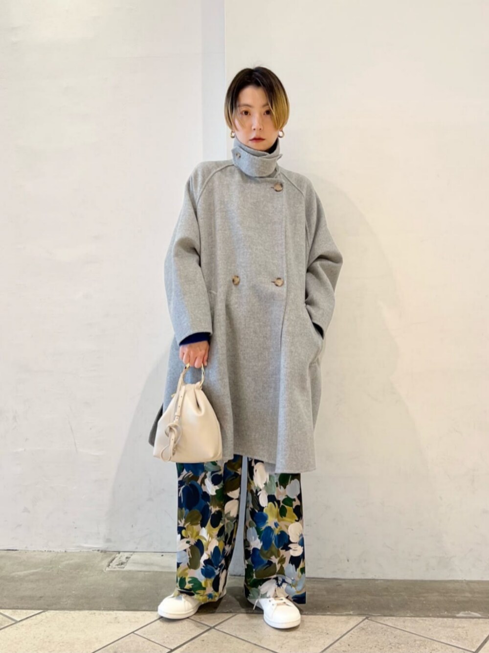 【サイズ感】 アウター:ゆったり(Mサイズ着用) トップス:標準的(ややコンパクト) パンツ:ゆったり(ウエスト1つ折り返してます) シューズ:24㎝で楽に履けました。 【コーディネートポイント】 ブルートーンで纏めました。アウターやバッグは明るめの色を選び、重くなりすぎないようバランスを取りました。