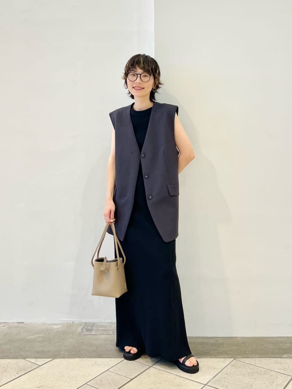 身長:158㎝ 普段サイズ:ワンピース/S、トップス/S、シューズ/23.5㎝ 【サイズ感】 ワンピース:標準的 ベスト:Mサイズ着用。ゆったり シューズ:37でジャスト。 【コーディネートポイント】 女性らしいラインのワンピースに、あえてオーバーサイズのベストを選びました。モード感を楽しめるコーディネートです。