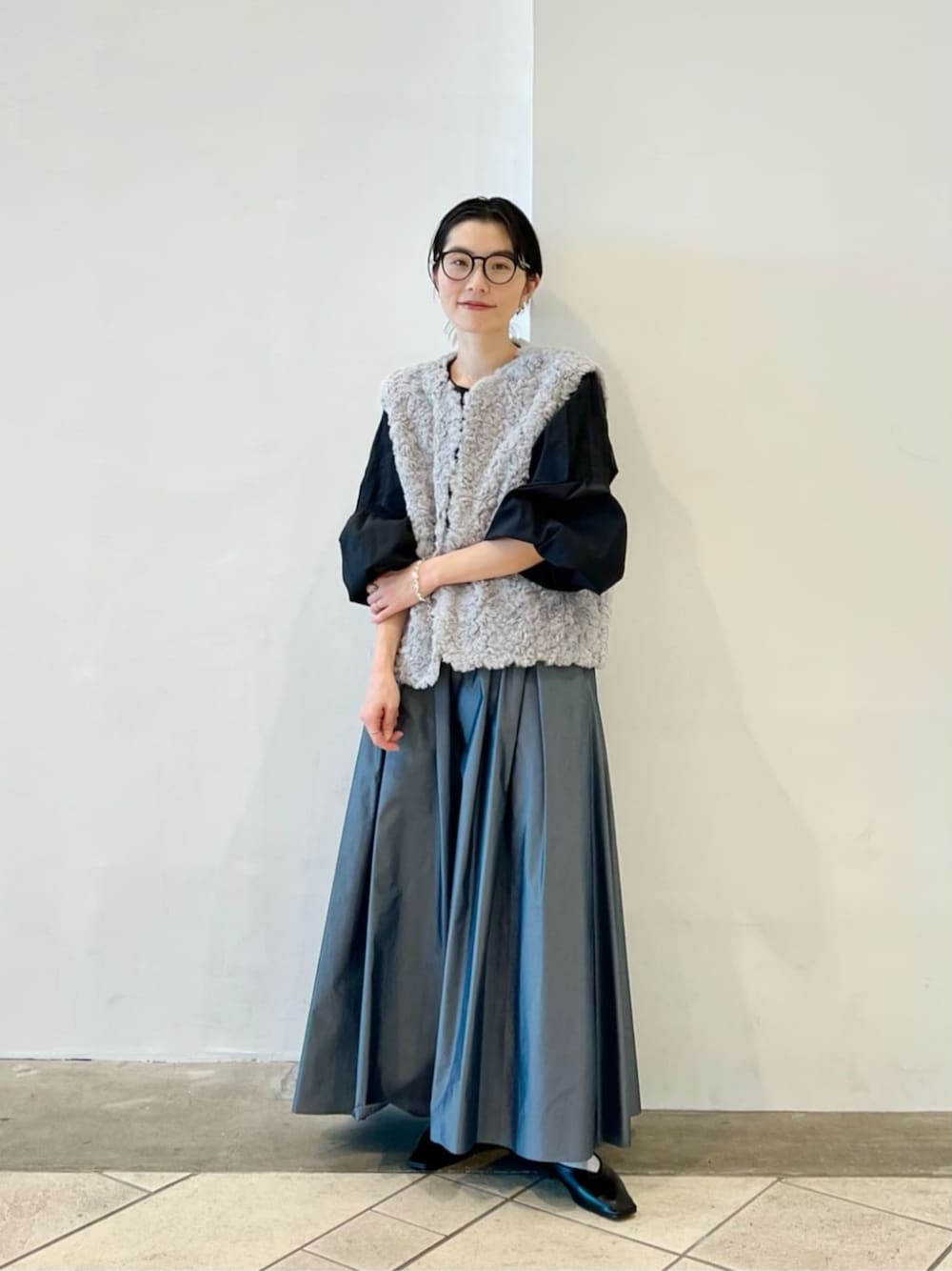 身長:158㎝ 普段サイズ:トップス/S、スカート/S、シューズ/23.5㎝ 【サイズ感】 ベスト:ゆったり トップス:ゆったり スカート:S着用。標準的 シューズ:普段サイズでジャスト 【コーディネートポイント】 ファーベストで季節感を意識した、フェミニンコーディネートです。