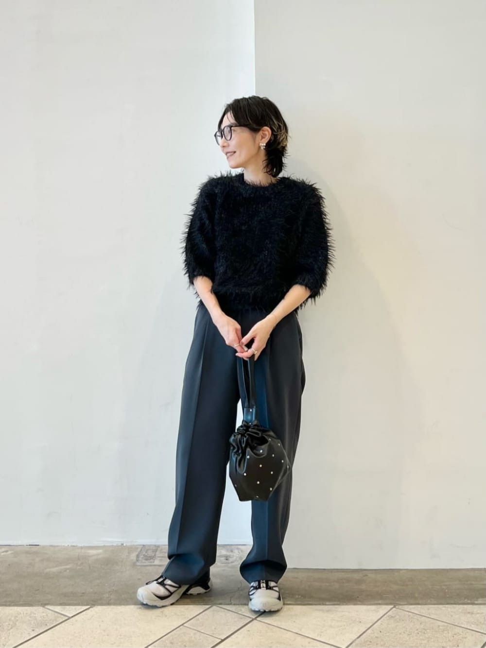 身長:158㎝ 普段サイズ:トップス/S、パンツ/S、シューズ/23.5㎝ 【サイズ感】 トップス:標準的 パンツ:S着用。標準的 シューズ:普段サイズでも少しゆとりを感じました。厚手のソックスを履く場合、ハーフサイズUPでも良さそうです。 【コーディネートポイント】 毛足が長く華やかなニットを、スニーカーでカジュアルにコーディネートしました。ブラックからグレーのグラデーションにして、全体にまとまりを持たせました。