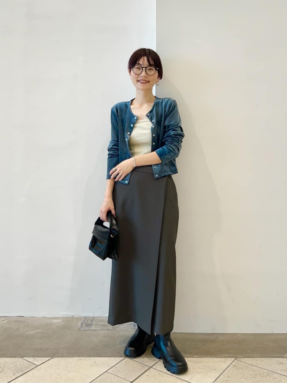 身長:158㎝ 普段サイズ:トップス/S、スカート/S、シューズ/23.5㎝ 【サイズ感】 カーディガン:ややコンパクト スカート:S着用。標準的 シューズ:37でジャスト 【コーディネートポイント】 巻きスカートのデザインが見えるように、トップスはコンパクトなものを選びました。足元をパンプスなどに変えていただくと、お仕事でもお召し頂けるキレイめコーディネートです。