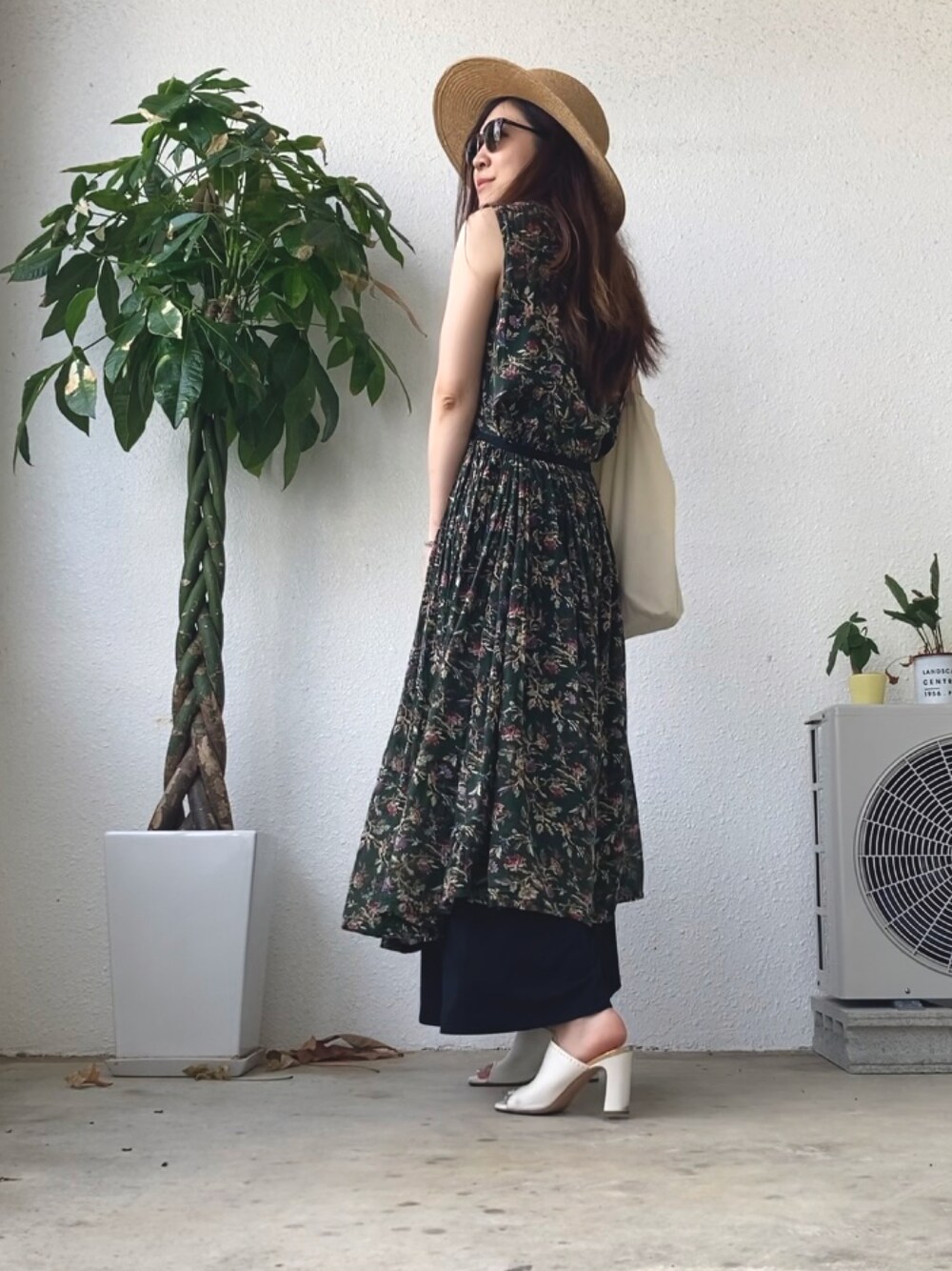 古着のワンピースにワイドパンツを重ねてシックなコーデに! 涼しげだけど重みもあって大人の夏お出かけスタイルに仕上げました𓂃 𓈒𓏸