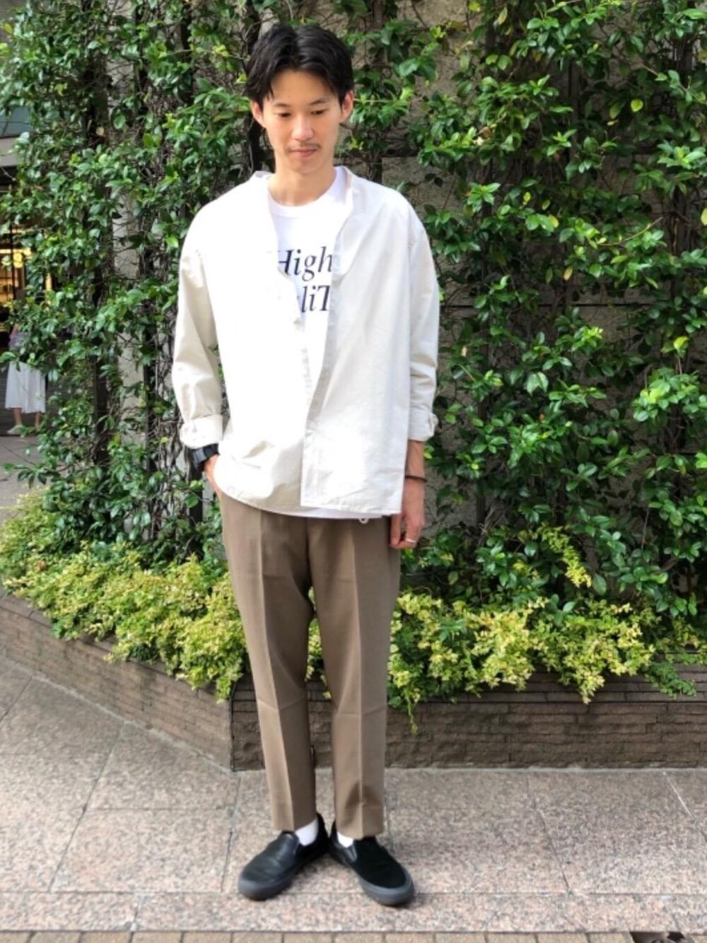 ナチャラルなトーンでまとめました。適度に張りのある生地感のシャツはこれからの季節に羽織りとしても使えるので便利です。