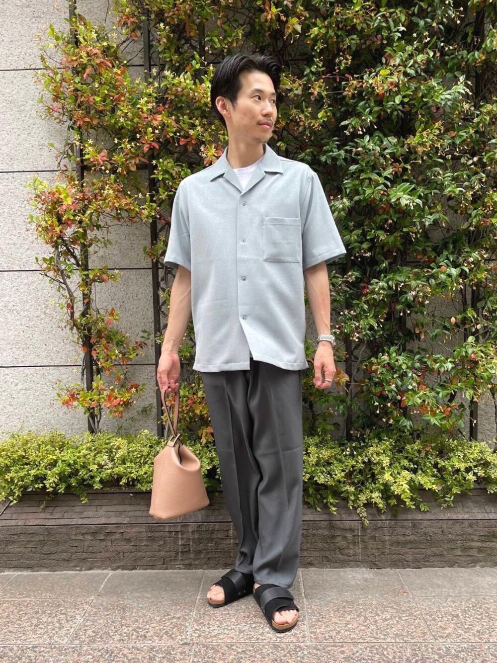 身長:175cm 普段サイズ:トップスL,パンツM,シューズ26.5 【サイズ感】 オープンカラーシャツ:ややゆったりめ ボトムス:ややゆったりめ サンダル:スニーカーに比べやや大きめ 【オープンカラーシャツの素材感】 ポリエステル100% 麻のようなシャリっとした素材。 やや光沢あり。 【オープンカラーシャツの着心地】 ドライタッチな素材で肌馴染みも良く、軽さがあり、夏場も快適に着用できます。 【コーディネートのポイント】 グリーンのトーンでまとめ、これからの季節に向けた爽やかなスタイリングにしました。カジュアルになりすぎないように、レザーサンダルやバッグをプラスして、上品さが出るように意識しました。
