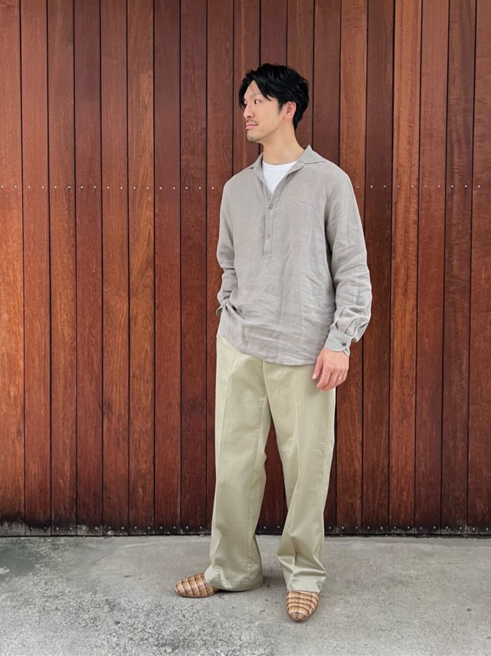 [サイズ感] シャツ(L):ややゆとりあり パンツ(L):ゆとりあり シューズ(42/27.5cm):標準サイズ [コーディネート] ベージュのワントーンコーディネート。リネンシャツやデザインのあるスリッポンで、軽さを感じる雰囲気にしています。