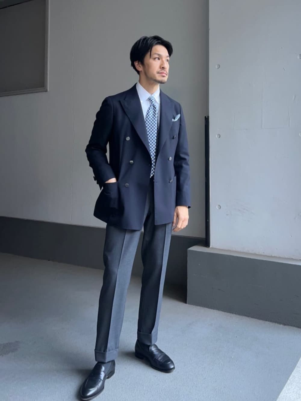 [サイズ感] ジャケット(48):標準的 シャツ(39):標準的 パンツ(48):やや細み テーパードシルエット シューズ(9/27cm):標準的 [コーディネート] なめらかな生地感のトロピカルウールジャケットをメインにコーディネート。6つボタンのダブルブレステッドなので、白シャツにグレースラックスとシンプルかつ正統派な印象となるよう組みました。