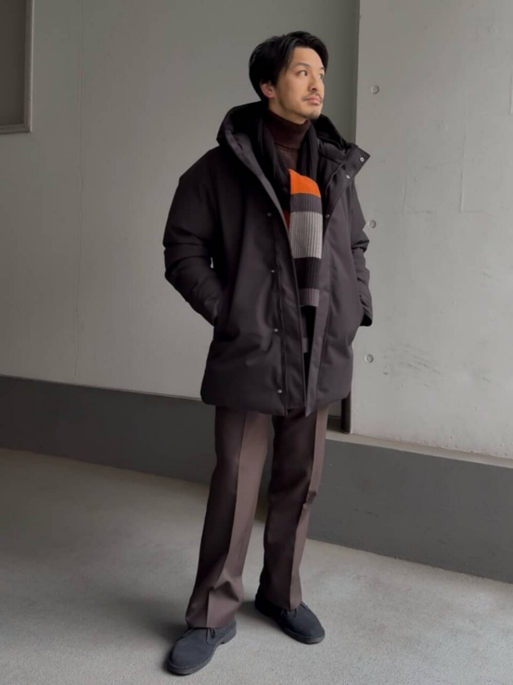 [サイズ感] ダウンジャケット(L):ややゆとりあり セーター(L):ややゆとりあり パンツ(L):ややゆとりあり ストレートシルエット シューズ(27cm/9):ちょうど良いサイズ感 ※普段靴サイズ 革靴:27cm スニーカー:28.5cm [コーディネートのポイント] ブラックとブラウンでまとめたコーディネートです。パンツにさりげなく施されたサイドラインが硬さをやわらげ、ボーダーのマフラーでカジュアル感をプラスしました。 ※本社にてサンプルで撮影