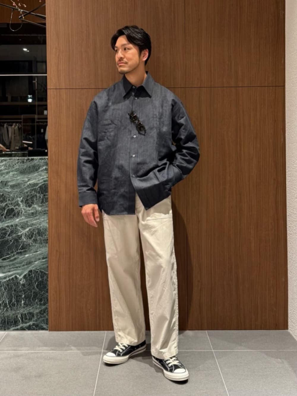 [サイズ感] シャツ(S):ゆとりあり L相当のサイズ感 Tシャツ(L):ややゆとりあり パンツ(30inc):ややゆとりあり シューズ(28cm/9h):ちょうどいいサイズ感 ※普段靴サイズ 革靴:27cm スニーカー:28.5cm [コーディネートのポイント] たっぷりとしたサイズ感のシャツと、ストレートシルエットのスッキリとしたパンツを合わせた大人のカジュアルコーディネートです。スニーカーは、洋服の配色に合わせた色めにしてまとめました。 [パンツ] 品名:KS 14 BAKER PT 品番:1169-599-9339 価格:¥42,900- 丸の内店にて販売中