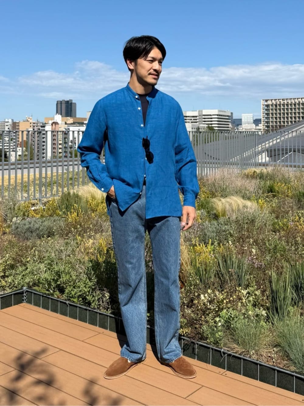 [サイズ感] シャツ(L):ややゆとりあり ジーンズ(L):ややゆとりあり シューズ(42):ちょうどいいサイズ感 ※普段靴サイズ 革靴:27cm スニーカー:28.5cm [コーディネートのポイント] あざやかなブルーカラーのシャツと、ブルージーンズでワントーンコーディネートを組みました。足元はアクセントに色を入れて、トラディショナルな雰囲気も加味しています ※本社にてサンプルで撮影