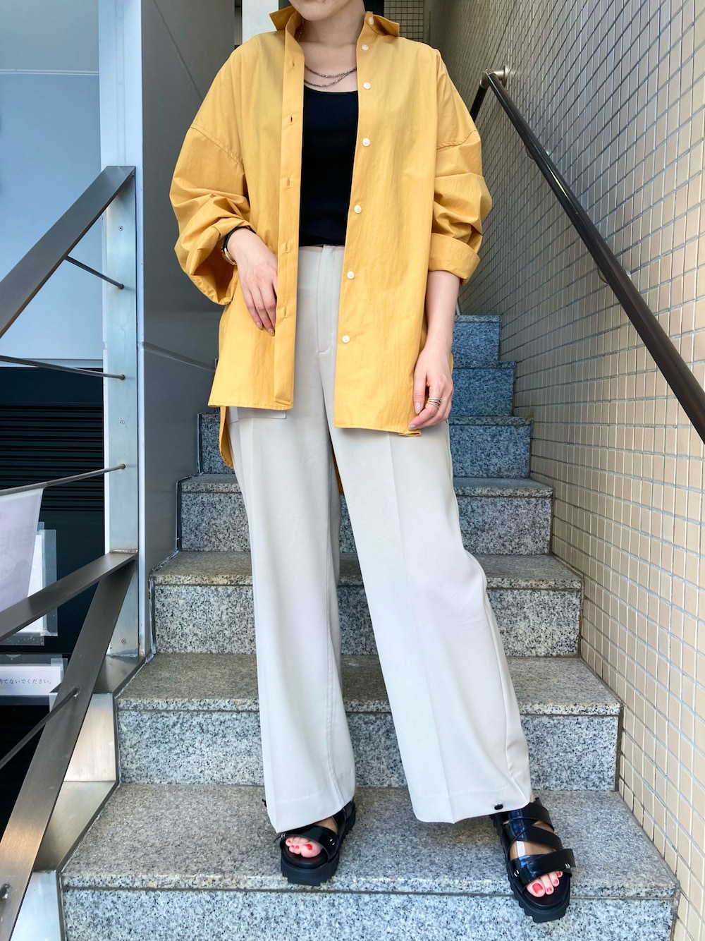 オレンジ色のシャツを使ったコーディネート。