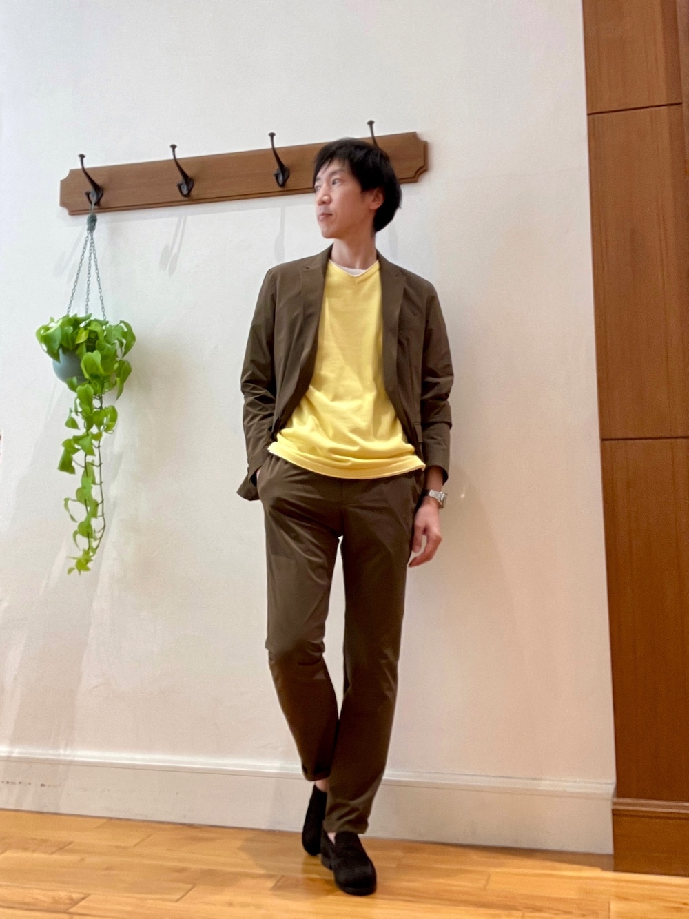 ナイロン素材の軽く、ストレッチ性抜群のセットアップ。 インナーにTシャツ付きVネックニットの春色を使ってビジネスカジュアルスタイルでまとめてみました。 ✨Instagram✨ ↓ @t.yamaguchi_nol