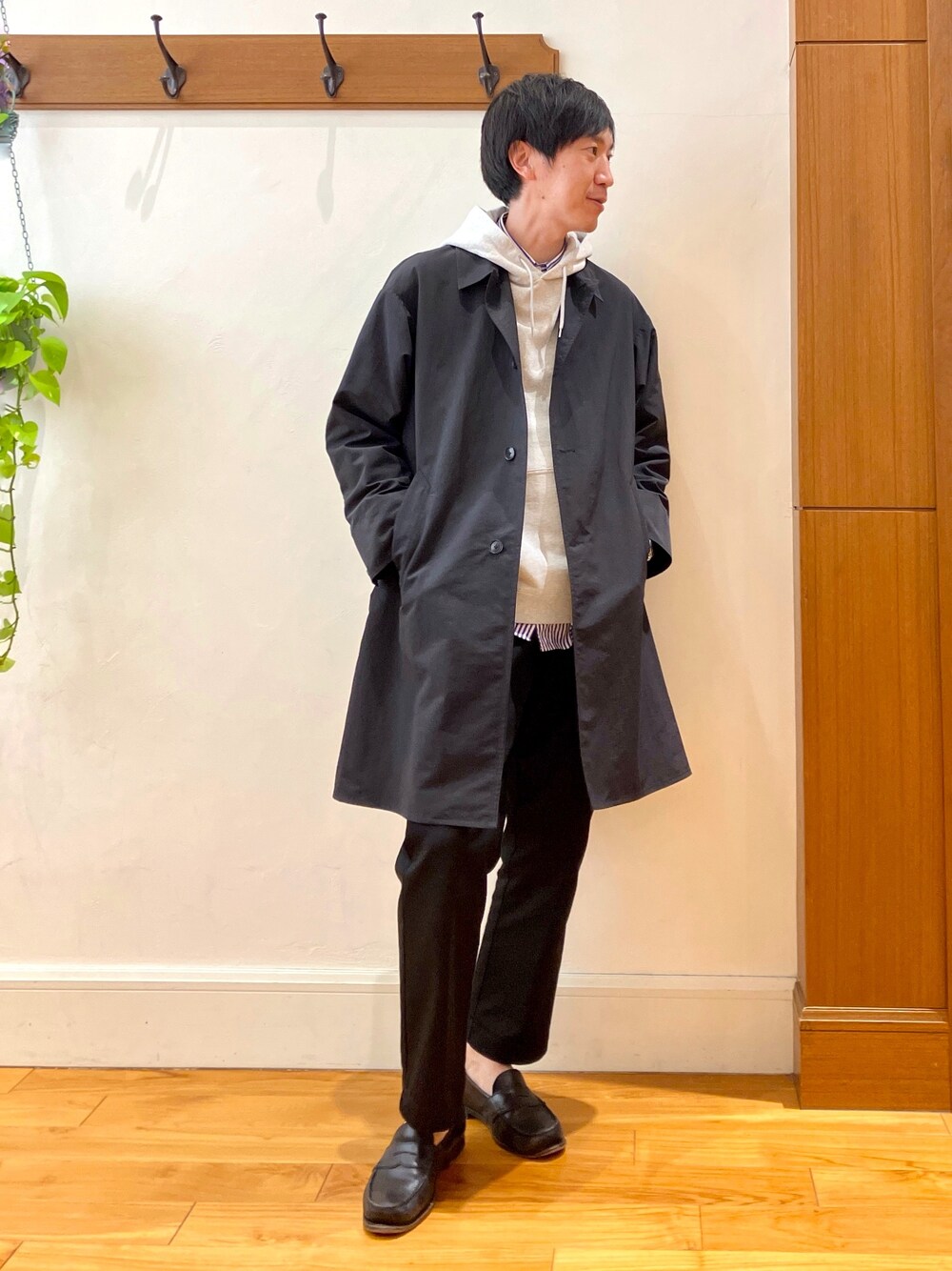 季節問わず安定のクロコーデ😀 パーカー✖︎スプリングコートの鉄板の組み合わせをモノトーンでシックにまとめてみました。 まるでシャツのように軽いゆったりコートがお気に入りです。 残念ながら背中のプリントが見えないのですが、【PENDLETON】の裏パイル地パーカーをインナーに着ています💦 ✨Instagram✨ ↓ @t.yamaguchi_nol