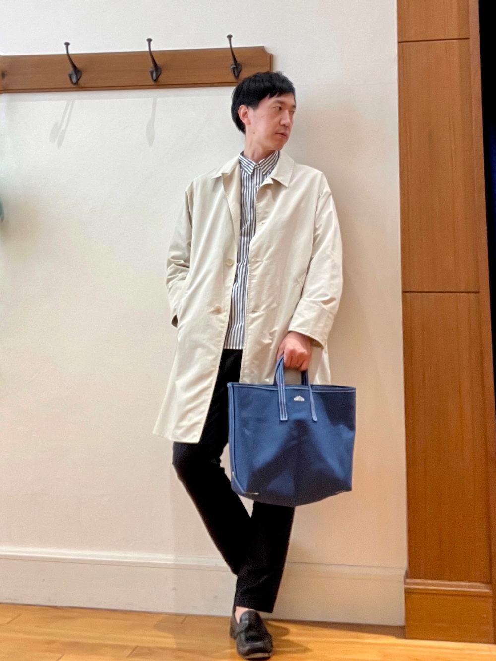 ON-OFF兼用スプリングコートスタイル。 アウターは【WORK ABOUT】のスプリングコート。とても軽く、まるでシャツを羽織っている様な着心地です。 シャツは日本のアウトドアブランド【NANGA】のdaily shirtsノーリーズ別注モデルです。生地と細かいディテールを変更してオールシーズン使える便利アイテムになっています。 【DANTON】のカラートートバッグで少し色を差してメリハリをつけてみました。 着用サイズ コート Lサイズ シャツ Lサイズ パンツ Lサイズ ✨Instagram✨ ↓ @t.yamaguchi_nol