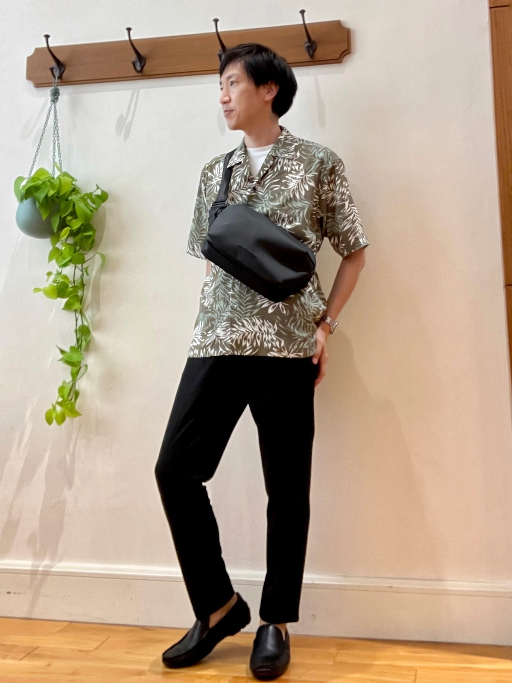 夏のバカンスコーデ🌞 アロハ風の総柄オープンカラーシャツを使ったバカンスコーデです♪ シャツは落ち感のあるポリエステル素材を使用したシワになりにくいタイプで、程よくゆとりのあるサイズ感です。 今回はラフになり過ぎないように細身のパンツとドライビングシューズで合わせましたが、 ワイドパンツやサンダルで思いっきりリゾート感を出してもよく合います😀 パンツは清涼感のあるカノコ素材で、暑い時期も快適に着ていただけます。 やや細身のテーパード型で、内側に収納可能なドローコードと後ろゴムのイージー仕様というON-OFF兼用タイプです。 バッグは日本の人気ブランド 【Beruf baggage】のボディバッグです。 シンプルなデザイン、高い防水性、実用性抜群のサイズ感でロングセラーとなっている名品です。 着用サイズ 総柄シャツ Lサイズ Tシャツ Lサイズ パンツ Lサイズ ✨Instagram✨ ↓ @t.yamaguchi_nol