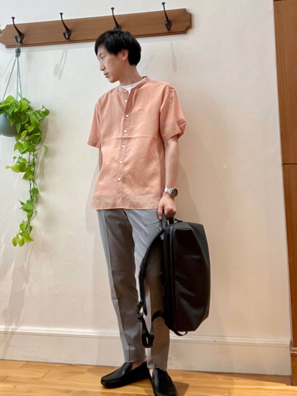 柔らかトーンの大人カジュアルスタイル。 ピンクオレンジカラーのバンドカラーシャツは トレンドのシアー素材で見た目にも軽く、夏のカジュアルスタイルにもってこいです🌞 インナーのクジラワッペン付きTシャツ、綿麻素材のテーパードパンツは共にノーリーズメンズの夏の定番アイテムで抜群の完成度の高さです🙆♂️ ピンク✖︎グレーの組み合わせは柔らかい雰囲気が良く出てくれるので個人的に好きな色合わせです。 バッグは日本の人気鞄ブランド 【beruf baggage】の定番バックパックです。 シンプルな外見と機能性にあふれた内部仕様でON-OFFどんなシーンでも活躍してくれます。 着用サイズ シアーシャツ Lサイズ Tシャツ Lサイズ パンツ Lサイズ バックパック 19リットルサイズ ✨Instagram✨ ↓ @t.yamaguchi_nol
