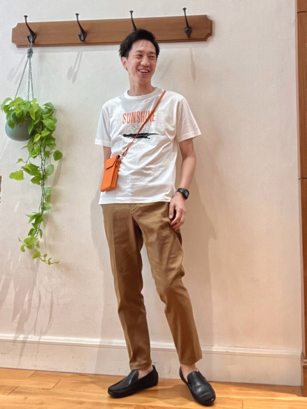 シンプルTシャツスタイル🌞 オレンジを差し色にしたTシャツコーデです。 プリントTシャツはノーリーズメンズではお馴染み【BARNS OUTFITTERS】の吊り編みTシャツです。 特殊な方法で作られた生地は独特のヴィンテージ感がある風合いで、着心地も抜群です。 やや小さめなサイズ感なので、いつもより1つ上のサイズで選んでも良いと思います。 パンツはサフィラン社製の高品質リネンを使用した清涼感溢れるストレッチタイプです。 ウエスト後ろゴム、内側に収納できるドローコード仕様でとても楽な着心地です。 鮮やかなオレンジのスマホショルダーバッグは 【SONNE】のユニセックスモデルです。 イタリアンレザーを使用し、高強度と発色の良さを両立しています。 夏のシンプルコーデの味付けにとても便利です🙆♂️ 着用サイズ プリントTシャツ XLサイズ ストレッチパンツ Lサイズ ✨Instagram✨ ↓ @t.yamaguchi_nol