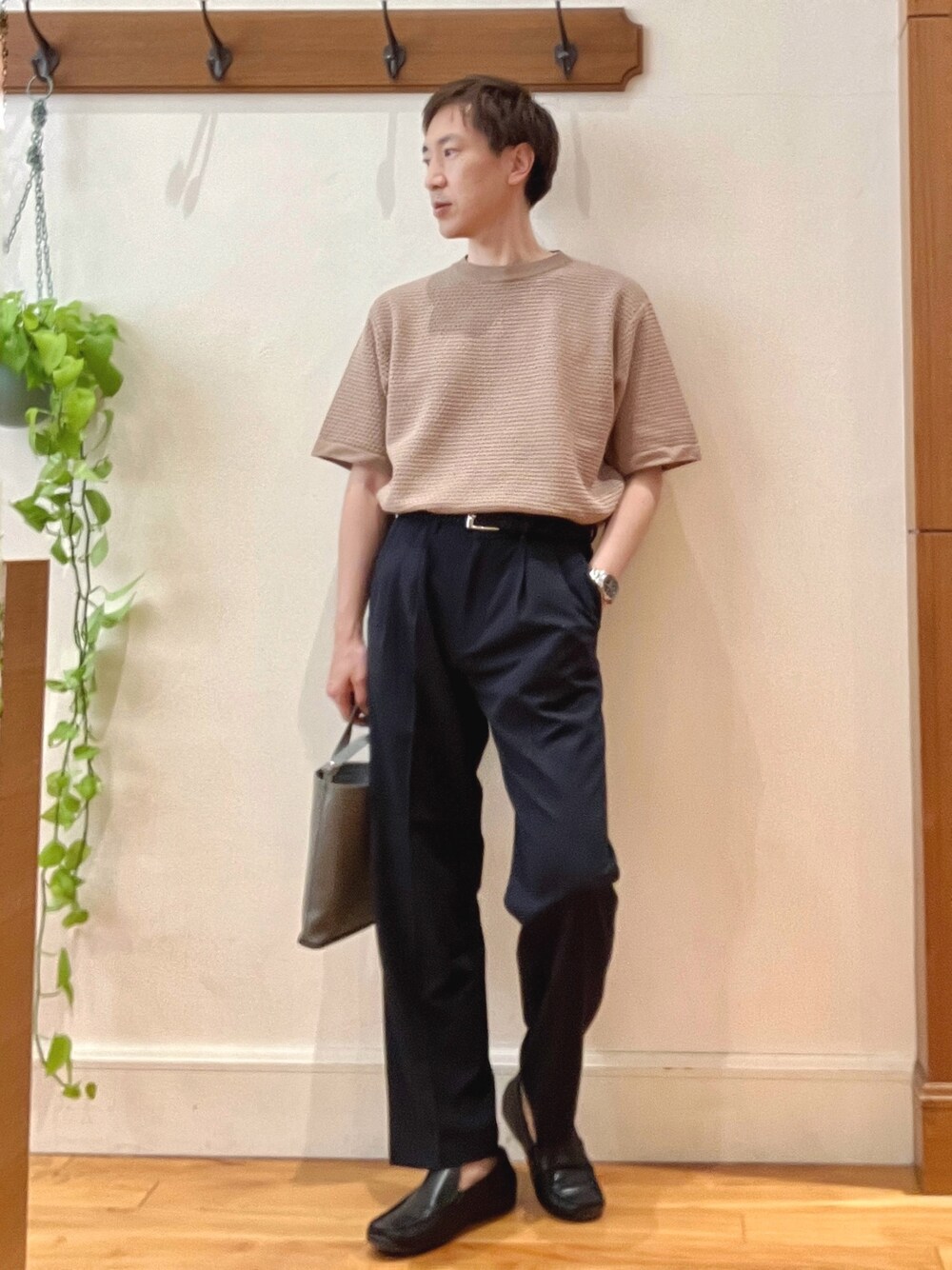 サマーニットで大人カジュアルスタイル😀 人気ブランド【BATONER】のサマーニットをワイドパンツと合わせたキレイめカジュアルコーディネートです。 ニットは特殊な新素材を使用したドライタッチな柄編みタイプです。 驚くほど軽量でゆったりシルエットなのでとても楽な着心地です。 パンツは高機能素材TRABESTを使用した防シワ、ストレッチ性、吸水速乾性に優れた2タックワイドパンツです。 軽量生地で、ワイドシルエットの肌離れの良さもあり、真夏も活躍してくれそうです。 ワイドシルエットですが、ウエスト、ヒップはスッキリしており、柔らかい生地で落ち感があるので大人カジュアルスタイルにピッタリなアイテムです。 ハイウェスト気味なので、トップスの裾をインにして腰高に見せるのもオススメです。 シンプルな組み合わせなので、ベルトとミニBAGで味付けしてみました。 着用サイズ サマーニット Lサイズ ワイドパンツ Lサイズ ✨Instagram✨ ↓ @t.yamaguchi_nol