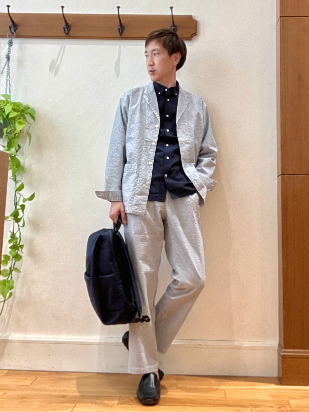 カジュアルセットアップスタイル😀 気温の高い時期にオススメなサッカー生地を使ったゆったりシルエットのセットアップコーディネートです。 インナーをカットソーではなくシャツにして大人カジュアル感を出してみました。 セットアップは吸水速乾性に優れたクールマックス素材で、軽く涼しくストレスフリーで着ていただけます。 少し大きめのサイズ感なのでインナーを選ばす、タウンユースからリゾートまで幅広く活躍してくれます。 ボタンダウンシャツはノーリーズメンズ定番のアイテムです。今回はリネンブランドの清涼感があるタイプを着用しています。 麻のチクチク感はほとんどないので、肌触りがとても良いです。 バッグは【Un coeur】のノーリード別注バックパックです。 シンプルなデザインで軽量で撥水加工を施した生地を使用しており、ON/OFF兼用でお使いいただけます。 着用サイズ ジャケット Lサイズ パンツ Lサイズ シャツ Lサイズ ✨Instagram✨ ↓ @t.yamaguchi_nol