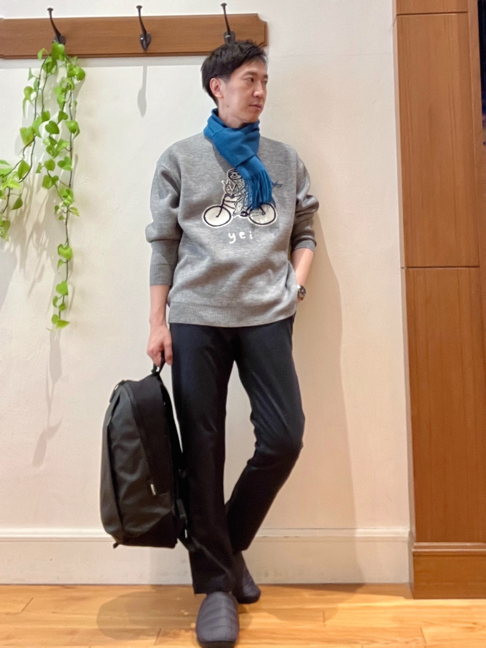 ポップなニットでリラックスカジュアルスタイル😀✌️ 思わず目を引くナマケモノ🦥が可愛いニットを使ってリラックス感のある大人カジュアルコーディネートです😁✨ ラフに合わせすぎるとだらしなくなりそうだったので、ダークトーンでまとめて、ブルーのマフラーを差し色に使いました。 【ニット🧶】 ナマケモノ🦥が目を引くダブルジャガードの冬用ニットです。 厚みのあるしっかりした編み地で、スウェット感覚で着用できます。 シルエットはややゆったりしています。 【パンツ】 毎年定番のワンダーシェイプイージーパンツの秋冬バージョンです。 温かみのある起毛感、360度全方向ストレッチ、膝から下のスッキリシルエットで毎冬人気のアイテムです✨ 【サンダル】 SUBU定番ウィンターサンダルです。 素足で履いても暖かく、高級毛布に包み込まれるような抜群の履き心地で毎年人気のアイテムです。 サイズ3は足サイズ29センチまで対応出来るので、足の大きい方も安心して使っていただけます。 【バックパック】 人気ブランドWexleyの定番STEMシリーズです。コーティングを施した前面が特徴で、黒1色使いながら、生地の違いで微妙なグラデーションになるオシャレ感があるタイプです。 身長182センチ 着用サイズ ジャガードニット Lサイズ ストレッチパンツ Lサイズ ✨Instagram✨ ↓ @t.yamaguchi_nol