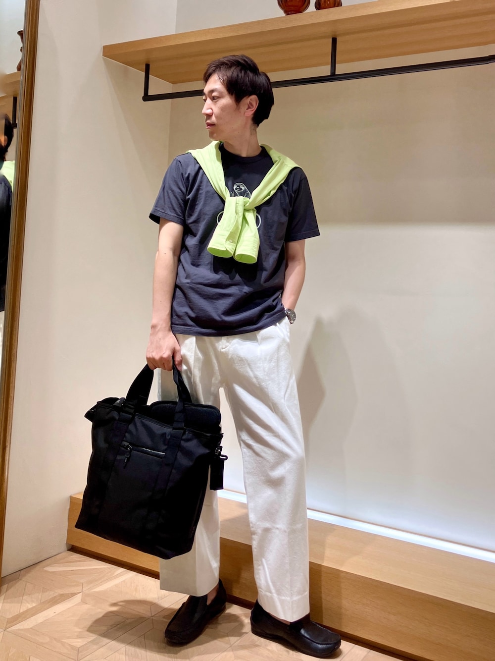 プリントTシャツスタイル😁☀️ ラフになりがちなプリントTシャツを肩かけカーディガン、ホワイトデニム、トートバッグ、ローファーで大人カジュアルスタイルに調整したお出かけコーディネートです♫ プリントTシャツは少し大きめのシルエットなので、ワイドパンツとのバランスを考えていつもより1サイズ下げてMサイズを着用しました。 【プリントTシャツ】 昨年登場から人気のナマケモノ🦥プリントシリーズのTシャツです。 適度に肉厚なヴィンテージ感のある生地を使用しており、丸胴仕立てで型崩れしにくく、着心地も抜群です♪ サイズ感はややゆったりです。 【ワイドパンツ】 柔らかいデニム生地を使った2タックワイドパンツです。 センタープレスラインの入ったトラウザー型なので、ワイドパンツはカジュアル過ぎて苦手…という方にも是非オススメです。 楽な着心地、裾上げなしですぐに使える絶妙な着丈、シーズンレスで着用可能な生地感。 1本あると様々なスタイリングに対応出来るアイテムです! 【トートバッグ】 🇧🇪ベルギーの人気ブランドWEXLEYの新型トートバッグAARON TOTE CORDURA BALLISTIC BLACKです。 上品な光沢感があり、堅牢性に優れたバリスティックナイロンを使用したタイプで、オフィスカジュアルスタイルにピッタリです‼️ ショルダーストラップが付属しており、2WAYで使用可能です😁 身長182センチ 着用サイズ プリントTシャツ Mサイズ ワイドパンツ Lサイズ