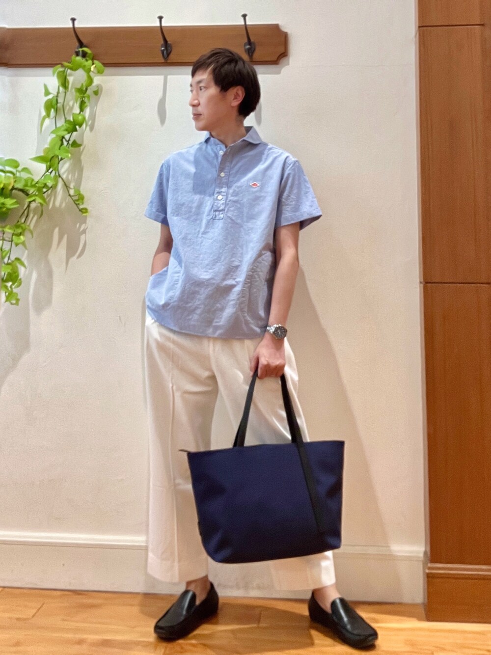 爽やか✨シャツスタイル😁☀️ 水色シャツ&ホワイトデニムパンツという爽やかな組み合わせのシンプルスタイル。 少し引き締めたかったのでダークネイビーのトートバッグを合わせました🎵 足元もスニーカーではなく、ローファーにして大人カジュアルコーディネートです😀 【シャツ】 DANTON定番の丸襟オックスシャツの半袖バージョンです☀️ 上品な襟の形、両脇のポケット、体のラインを拾わない程よいボックスシルエットが特徴で毎年人気のシリーズです‼️ 【ワイドパンツ】 柔らかいデニム生地を使った2タックワイドパンツです。 センタープレスラインの入ったトラウザー型なので、ワイドパンツはカジュアル過ぎて苦手…という方にも是非オススメです。 楽な着心地、裾上げなしですぐに使える絶妙な着丈、シーズンレスで着用可能な生地感。 1本あると様々なスタイリングに対応出来るアイテムです! 身長182センチ 着用サイズ 半袖シャツ メーカー表記42サイズ デニムパンツ Lサイズ
