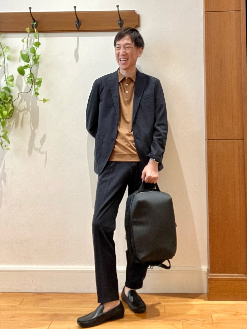 イージーセットアップでオフィスカジュアルスタイル😀✨ カノコ素材のON/OFF兼用セットアップとポロシャツを合わせたオフィスカジュアルセットアップです🎵 【セットアップ】 高いストレッチ性・軽量性•耐久性を備えた高機能素材Primeflex(R)を使用したカノコ素材のセットアップです✨ ドライな肌触りで、暑い時期も活躍してくれます☀️💦 パンツもウエストゴム仕様のイージータイプで、キレイなシルエットながら履き心地はとても楽です。 【ポロシャツ】 サラッとした光沢のあるシルケット素材の上品なポロシャツです。 夏向けイメージの強いポロシャツですが、今回着用したキャメル色は秋服との相性も良く、長期間活躍してくれます😁 【バックパック】 日本の人気鞄ブランドberuf baggageのハイエンドモデルです。 細かいウンチクがあり過ぎて紹介しきれませんが、日本人が好むディテールがコレでもかと詰め込まれた名品です✨ 職場で同僚に自慢できる事間違いなしのアイテムです😁 身長182センチ 着用サイズ ジャケット Lサイズ パンツ Lサイズ ポロシャツ Mサイズ