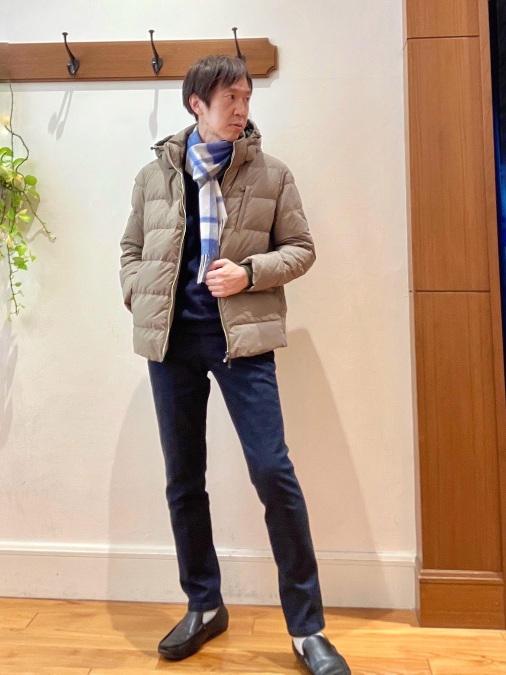 冬の大人カジュアルスタイル😀☃️ 明るめカラーのダウンジャケットとチェックマフラーを使ってデニムパンツとメリハリをつけた冬の大人カジュアルコーディネートです♫ ダウンジャケットもデニムパンツも細めのシルエットなので、スッキリした清潔感のある雰囲気がお気に入りです🤩♫ 【ダウンジャケット】 撥水性抜群の生地を使用した実用性抜群のダウンジャケットです! スッキリしたシルエットが特徴で、ウエスト周りが細く見える絶妙なデザインです✨ ダウンジャケットの着膨れが苦手な方に是非オススメのアイテムです😁 【ハイネックニット】 肌触り抜群のカシミア混ウールのハイネックニット🧶 冬のキレイめカジュアル、ビジカジスタイルにピッタリです‼️ ネック、袖口、裾はリブ仕様ですが、それ程締め付け感はなく、 ストレスフリーの着心地です♪ 【デニムパンツ】 ノーリーズグッドマンオリジナルのデニムパンツ👖細めのテーパードシルエットで、美脚効果抜群です。 デニム生地ですがそれ程カジュアル感が強く無いので、ジャケットと合わせてビジカジスタイルでの着用もオススメです😀 身長182センチ細身体型 着用サイズ ダウンジャケット Lサイズ ハイネックニット Lサイズ デニムパンツ Mサイズ