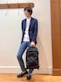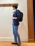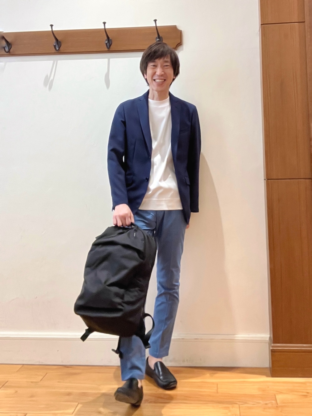 カラーパンツで オフィスカジュアルスタイル😀✨ ライトブルーのカラーパンツとネイビージャケット、シロTシャツを合わせたビジカジコーディネートです☘️ いつもならグレーかベージュのパンツを合わせたくなるところでしたが、爽やかさ溢れるライトブルーパンツ🩵が春の季節感もあって素敵だったので登場させました。 いつものジャケパンスタイルに変化をつけたい方にカラーパンツは是非オススメです♫ 【ジャケット】 真夏と真冬以外の季節ならいつでも着用可能なポリエステルブッチャー生地の細めシルエットジャケットです♫ 肌触りが良く、シワになりにくく、吸水速乾性に優れた機能素材を使用しており、お手入れも楽な便利アイテムです。 【カットソー】 定番のシルケットスムースドレスTシャツです✨ 滑りが良く、キレイな微光沢の綿素材でジャケットのインナーに最適です。 汚れ対策に後ろ衿を少し高くしたり、裾がリブ仕様になっていたりと細かいところまでこだわっており、今年はさらに脇部分に消臭テープを縫い合わせる改良を施しています😁 【パンツ】 ON/OFF兼用で着用できる 綿麻Cool Max素材の細めのテーパードパンツです♫ 特に膝から下がスッキリ見えると好評です。 毎年人気の定番アイテムで、どんなスタイリングにも合わせる事が出来るシンプルさが特徴です✨ 【バックパック】 ヨーロッパの人気BAGブランドWexleyの JACOBシリーズです😀 ウェクスレイブラントの中ではON/OFF兼用という位置付けで、どんな服装でもよく合うデザインです♫ 約22リットルサイズの容量で、大き過ぎず小さ過ぎずの絶妙なサイズ感なので、幅広いシーンで活躍してくれます♪ 堅牢性に優れたバリスティックナイロンを使用し、綺麗な状態を長期間維持できる優れ物です! 身長182センチ細身体型 着用サイズ ジャケット Lサイズ カットソー Lサイズ パンツ Mサイズ