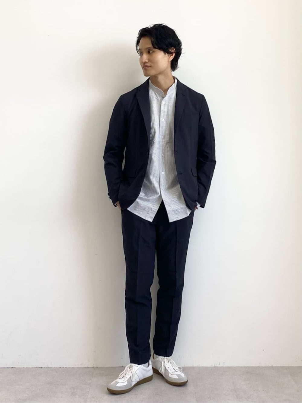 【着用した際のサイズ感】 178センチ/標準体型/靴28.0-28.5cm セットアップ:Lサイズ着用:ジャスト シャツ:Lサイズ着用:ジャスト シューズ:44サイズ着用-ジャスト 【コーディネート】 EC限定商品着用。 セットアップにバンドカラーシャツを合わせたキレイめスタイル。 足元は清潔感の出る白で合わせています。