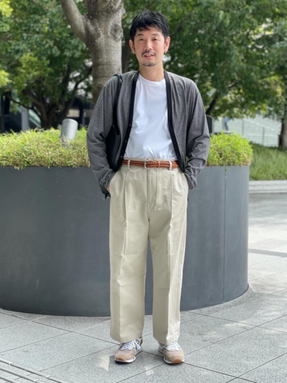 【身長】176.0cm 【普段サイズ】シャツ:Lサイズ ボトムス:Lサイズ シューズ:27.0,27.5cm 革靴26.0cm 【サイズ感/着心地】 カーディガン:ややゆるめ/着丈長めで軽い着心地 カットソー:ややゆるめ/リラックス感のある着心地 パンツ:ワイドシルエット/リラックス感のある穿き心地 【着心地】 カーディガン:薄手なので軽く羽織れます。 カットソー:肌触りが良く一枚着としても着用頂けます。 パンツ:しっかりとした生地感でストレスのない穿き心地。 【コーディネートポイント】 品のあるウール素材のカーディガンは薄手で風通しもよく今時期からもお召し頂けます。 今っぽいワイドシルエットのパンツを合わせて久しぶりのお出かけスタイルを意識しました。