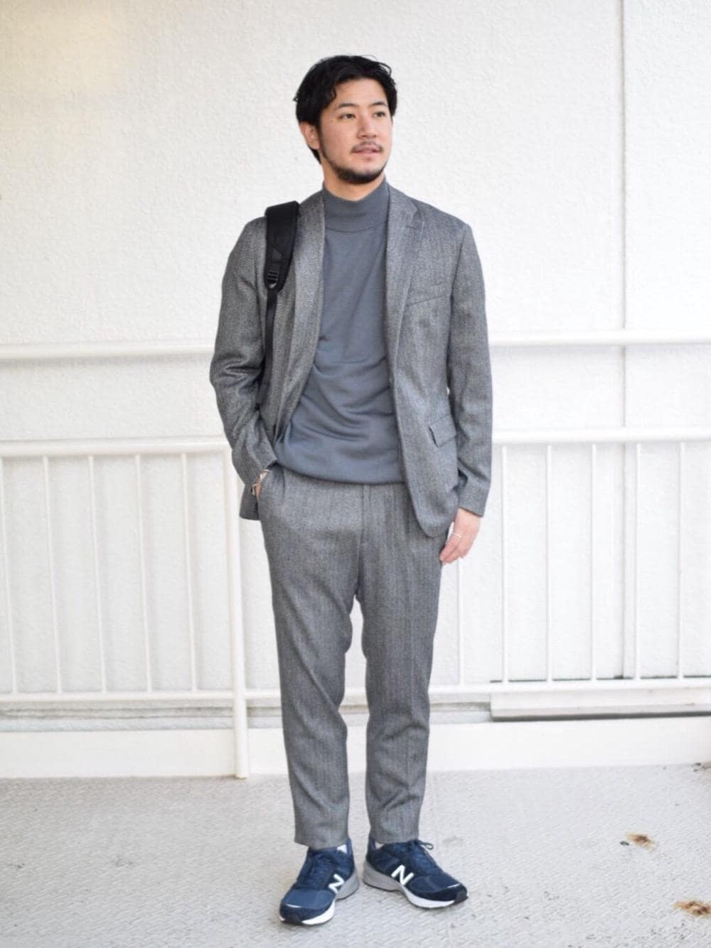 毎シーズンご好評いただいておりますセットアップですが今回はヘリンボーン柄で上品なコーディネートが可能です。 ジャケットの柄を活かし同系色のインナーと合わせて落ち着きのあるモダンなコーディネートを意識しました。