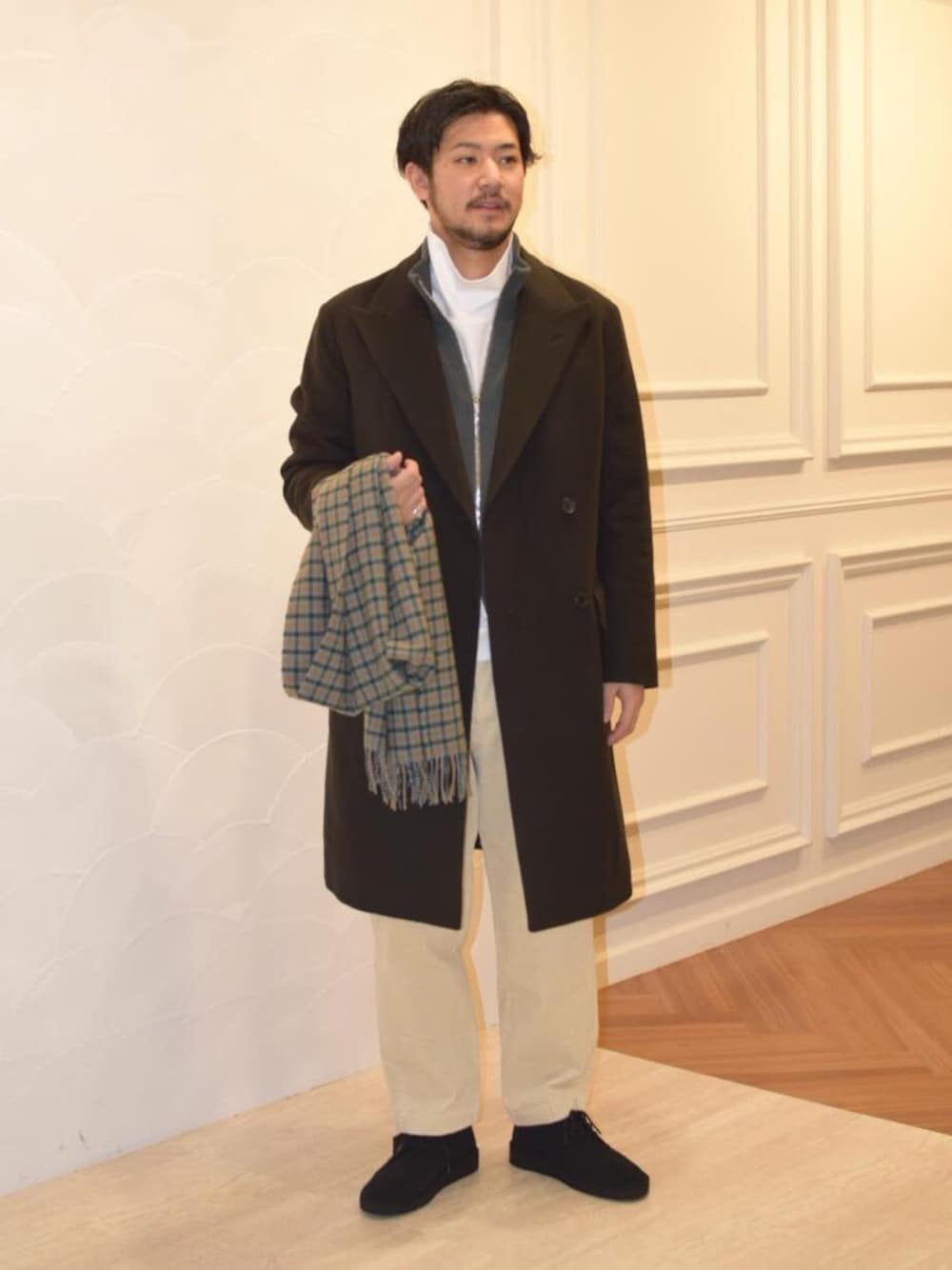 ややゆとりのあるダブルのチェスターコートに白のコーデュロイパンツを合わせカジュアルなコーディネートに致しました。