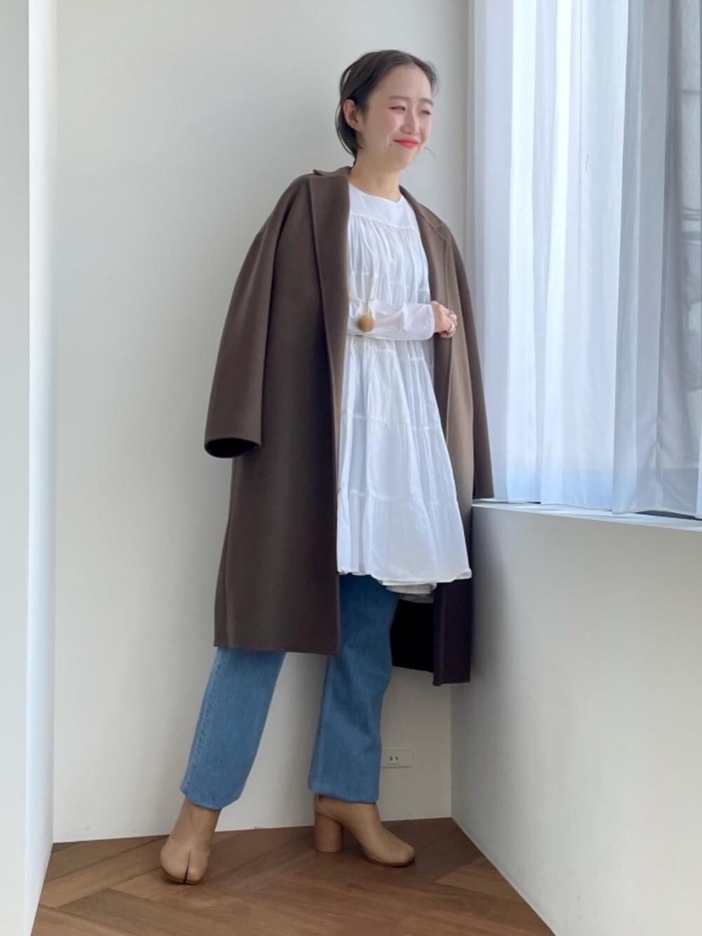 ティアードのボリュームが甘い印象のワンピースには、落ち着いた色味のブラウンのテーラードコートと淡いブルーのデニムを合わせ、メンズライクなカジュアルさを取り入れました。足元は柔らかな色味のレザーブーツで全体のバランスを意識してしいます。