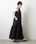 ティアードのディティールがおしゃれなノースリーブのワンピース。夏だけではもったいないので、袖のボリュームが今季のトレンドを象徴する〈 ceciliebahnsen 〉のブラウスを重ねてコーディネートしました。オールブラックでシックにまとめた日は、小物に差し色を合わせて華やかに。