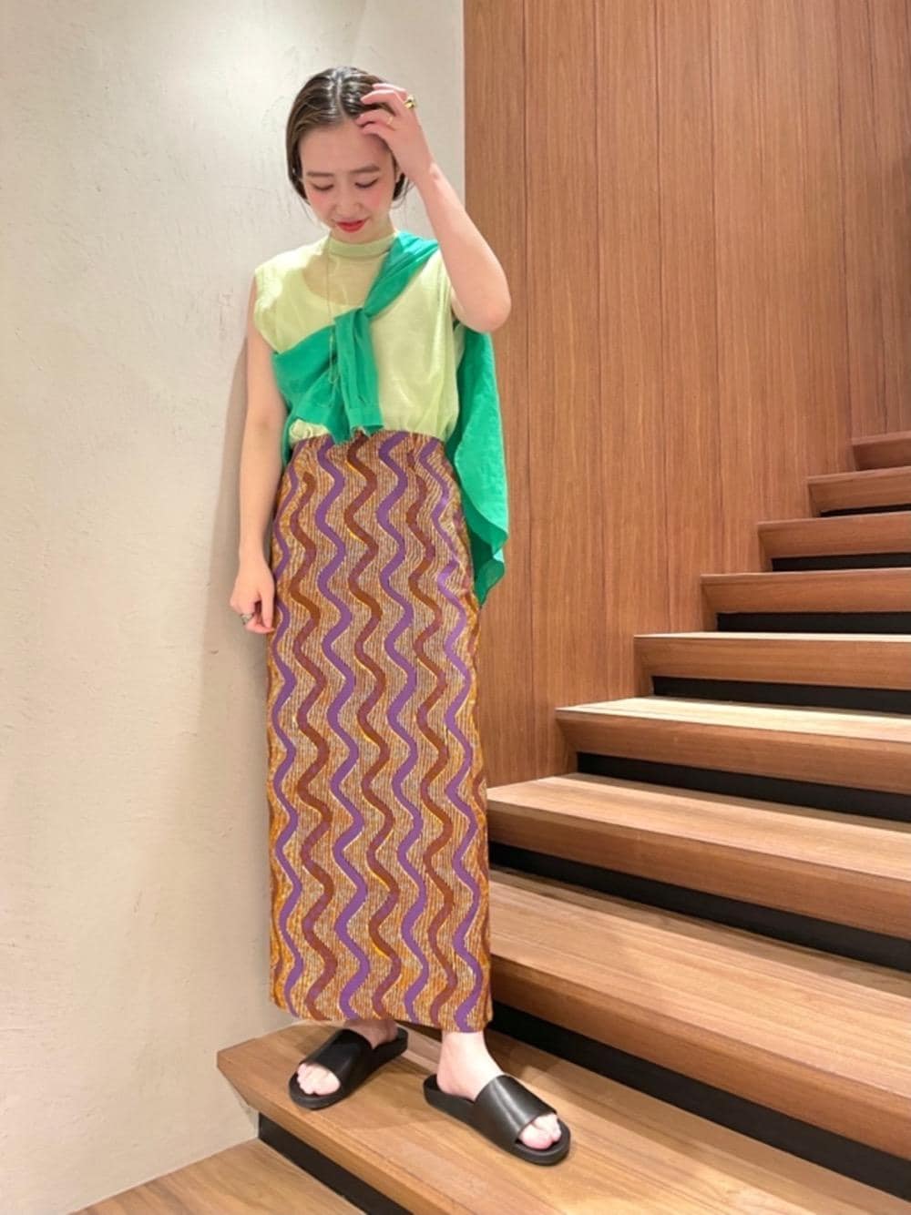 ●身長:156cm ●普段サイズ:トップス・ボトムス34か36 / シューズ23.5cm 【サイズ感】 トップス:標準的 ボトムス:ややウエスト細め シューズ:標準的 【素材感・着心地】 トップス:インナーとのレイヤードを楽しめる透け感が魅力です。 ボトムス:軽くて、深めのスリットで足捌きも楽です。 【コーディネートポイント】 思いっきりリゾート気分を演出して、シアーのノースリーブとエスニックな雰囲気の柄のタイトスカートの組み合わせ。シアートップスのインナーにはホワイトのタンクトップを合わせることでスポーティーで爽やかな印象に。今期販売している柄のボトムスの中でもタイトスカートのシルエットはカジュアルになりすぎず、大人の女性におすすめしたいシルエットです。
