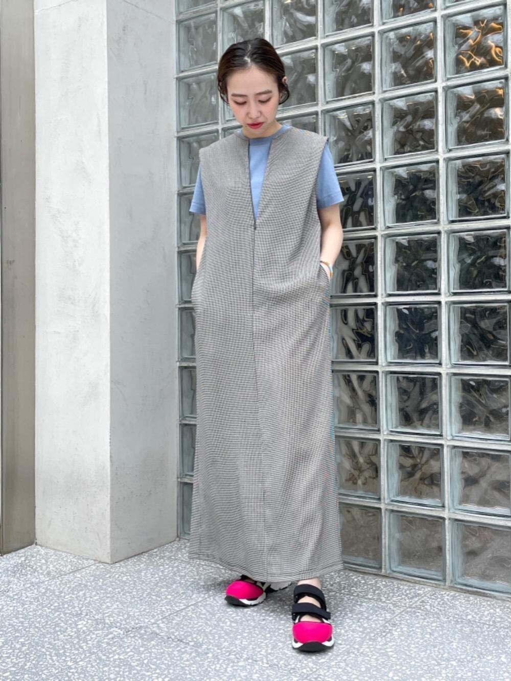 ●身長:156cm ●普段サイズ:トップス・ボトムス34か36 / シューズ23.5cm 【サイズ感】 ワンピース:ゆったりと身幅があり、着丈は長めです シューズ:ホールド感あり 【素材感・着心地】 ボトムス:かなり軽い着心地です 【コーディネートポイント】 〈 DAISUKE OBANA 〉の新作のチェック柄のワンピースはアイラインですっきりとしたシルエット。一枚で着ても様になりますが、今回はライトブルーのTシャツをセットインして、少しカジュアルな印象に。発色の鮮やかなピンクのスニーカーサンダルで遊び心を演出したのもポイントです。