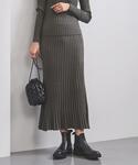●身長:156cm ●普段サイズ:トップス・ボトムス34か36 / シューズ23.5cm 【サイズ感】 トップス:体のラインを拾うタイトなシルエット。 スカート:腰回りは細身で裾にかけて広がります。 【素材感・着心地】 トップス:柔らかく肌に馴染む着心地。 スカート:柔らかく締め付けのない伸縮性が魅力。 【コーディネートポイント】 女性らしさが際立つ、タイトなリブのニットアップはロングブーツを合わせることで今年らしい印象に。テーラードのウールコートでスタイリッシュさを残しつつ、抜け感も出るように全体的に柔らかい色使いを意識しています。