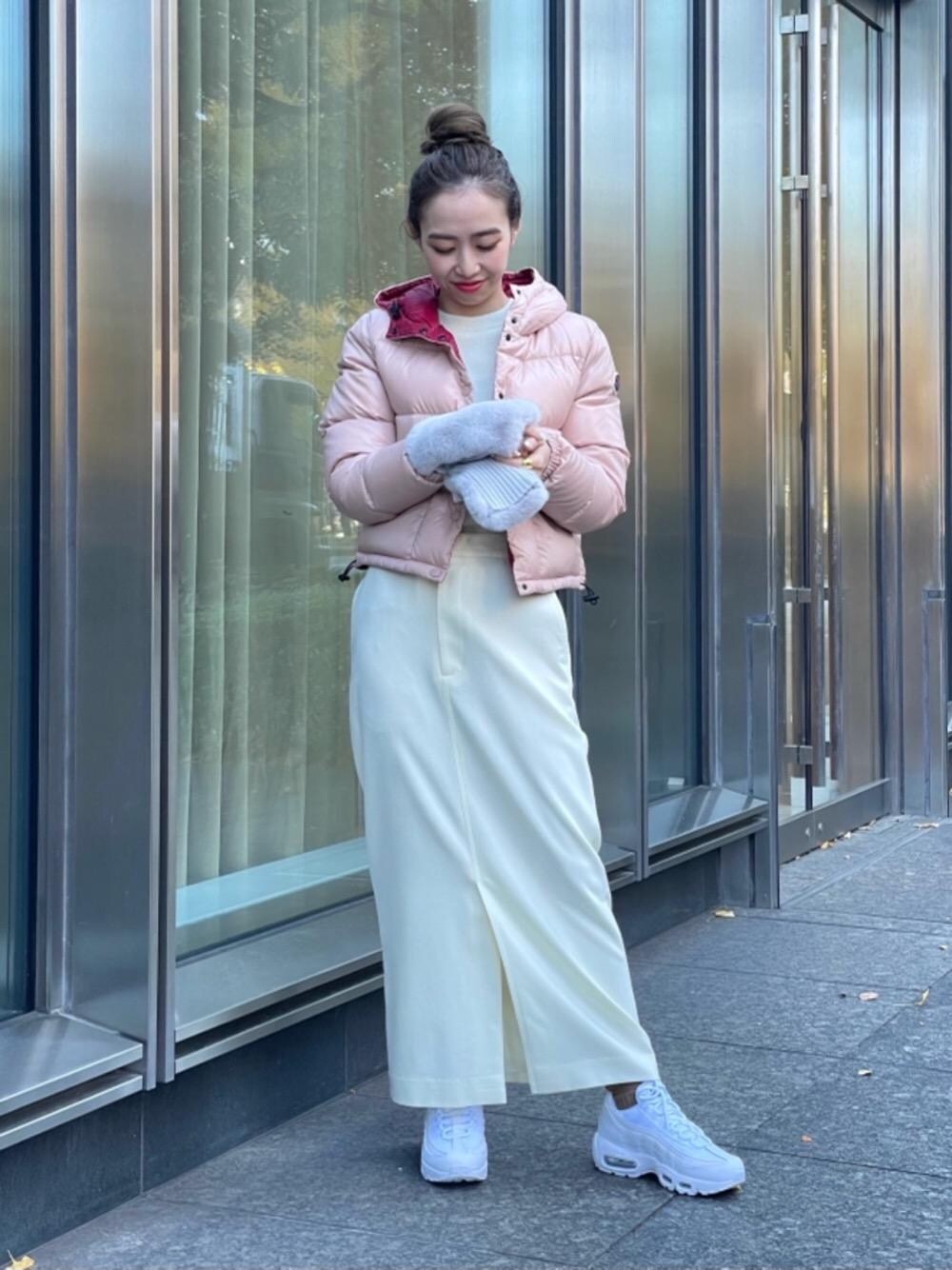●身長:156cm ●普段サイズ:トップス・ボトムス34か36 / シューズ23.5cm 【サイズ感】 アウター:やや小さめ。 トップス:標準的。 スカート:腰回りが細身。 【素材感・着心地】 アウター:かなり軽量、暖かい。 トップス:薄手でサラッとした着心地。 スカート:腰回りフィット感あり、暖かい。 【コーディネートポイント】 ダークトーンのダウンに飽きてきた方におすすめしたい、ピンクのショートダウン。収まりの良いコンパクトなデザインはフレアスカートやワイドパンツとも相性が良いですが、今回はタイトスカートで大人の女性らしさを意識しました。足元は敢えてスポーティーにスニーカーを合わせて抜け感を。