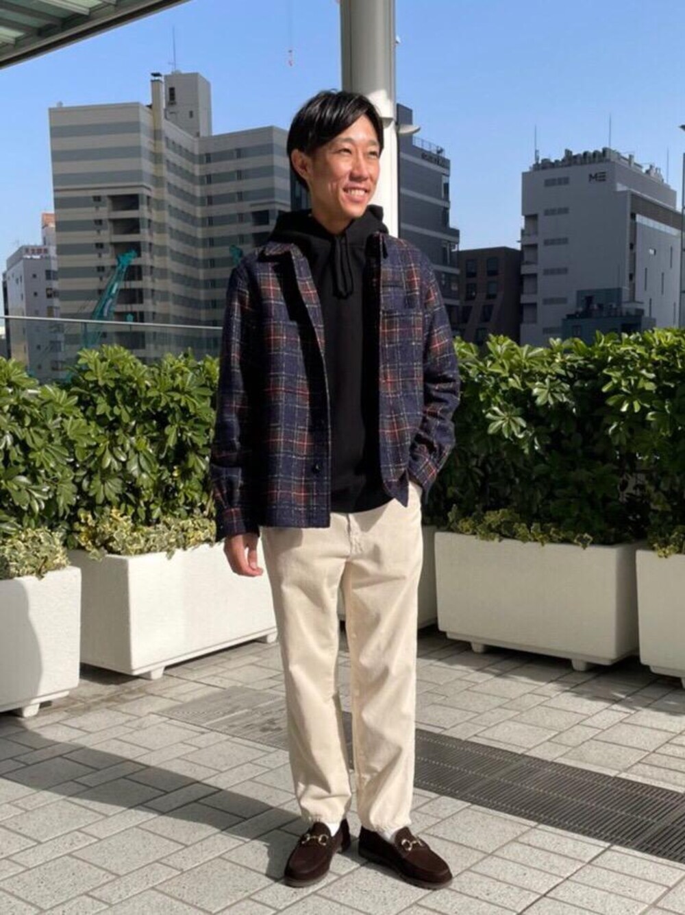 起毛感のあるタータンチェック柄のワークジャケットが主役のコーディネートです。<TUBE>のワークジャケットは多彩な糸で織られた生地で他にはない存在感を出してくれます。