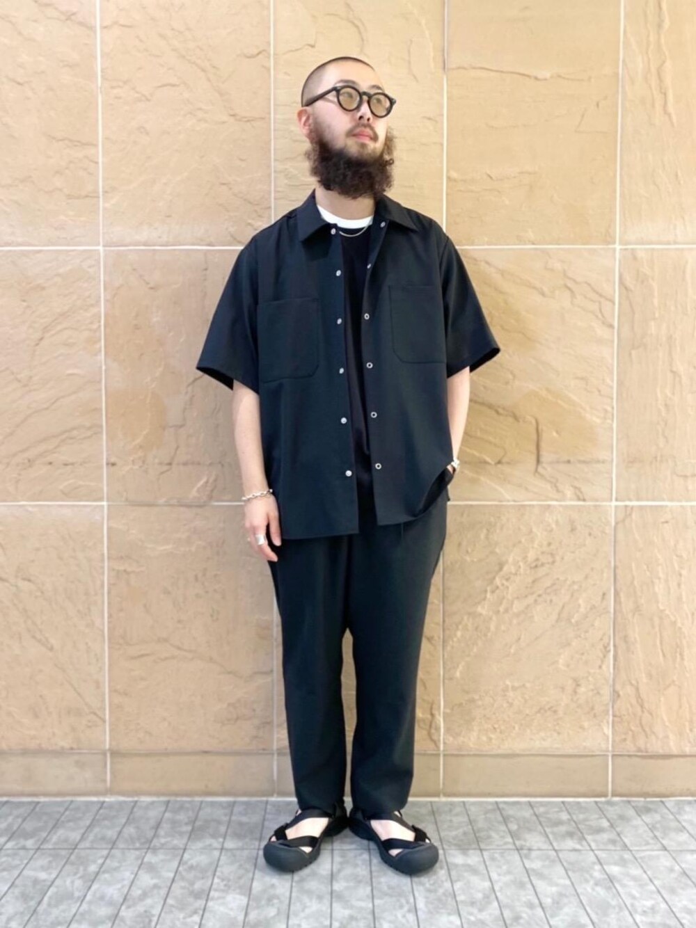 年齢:20代後半 身長:168cm 普段サイズ:トップス M.L/パンツ M.L/シューズ26cm 【サイズ感】 シャツ: 身幅広め カットソー:標準 パンツ:ややゆったり/着丈すっきりめ シューズ:標準 【素材感】 シャツ:ウール混の光沢感がある素材 カットソー:ポリエステルとコットンのツヤのある素材 パンツ:非常に軽くシャリ感がある 【着心地】 シャツ:サラッとしていて着やすい カットソー:サラッとしていて着やすい パンツ:非常に軽く肌離れがよい 【コーディネートポイント】 マンネリしがちな半袖シャツのコーディネートを、インナーにリンガーティーシャツを合わせることで、変化を加えました。